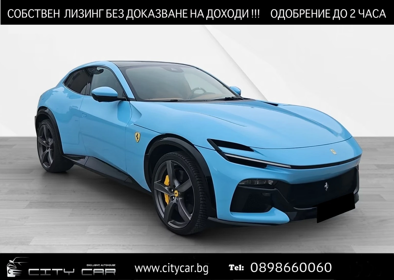 Над 20 години ние от CITY CAR предлагаме отбрани автомобили за нашите клиенти. Гордеем се с изграденото доверие и истинските приятелства. Имаме многогодишни традиции и работим с доверени водещи автокъщи и представителства от ГЕРМАНИЯ. Всички коли са проверени и със сервизна история. За нас е удоволствие да Ви предложим индивидуални условия за лизинг. Многогодишната ни практика на работа с най- големите лизингодатели е изградила доверие в нас с което клиентите на CITY CAR могат да се ползват, получавайки СПЕЦИАЛНИ УСЛОВИЯ И ИНДИВИДУАЛЕН ЛИЗИНГ, както и СОБСТВЕН ЛИЗИНГ БЕЗ ДОКАЗВАНЕ НА ДОХОДИ С ПРЕФЕРЕНЦИАЛНИ УСЛОВИЯ. С радост ще ви помогнем заедно да намерим подходящия за вас автомобил, който да отговаря на вашите жалния и бюджет. Предлагаме ВНОС НА АВТОМОБИЛИ И ДРУГА ТЕХНИКА ОТ ЧУЖБИНА ПО ЗАЯВКА, можем да изготвим индивидуална ПРОГРАМА ЗА ИЗКУПУВАНЕ и СМЯНА НА Вашия АВТОМОБИЛ, както и да предложим РЕГИСТРАЦИЯ В КАТ И СПЕЦИАЛНИ ЗАСТРАХОВКИ. Екипът на CITY CAR е съставен от експерти с опит, които са на Ваше разположение от понеделник до петък от 9: 00 до 18: 00, и събота от 9: 00до 15: 00 часа. При заявка от Ваша страна, може да Ви обслужим и в извън работно време. Не се притеснявайте да се свържете с нас ! Адрес: София, ул. Бойчо Бойчев 61 (Околовръстен път) Тел: 0898 66 00 60; 0899 92 81 00; 02/956 95 10 Описание на превозното средство: - СПИРАЧНИ АПАРАТИ В ЦВЯТ ДЖАЛО МОДЕНА - КАРБОНОВ ПРАГ - ПАНОРАМЕН ПОКРИВ - ИЗПУСКАТЕЛНИ ТРЪБИ С ЧЕРНО КЕРАМИЧНО ПОКРИТИЕ - АЗУРО ЛА ПЛАТА - ЗАДЕН ЕМБЛЕМА СКАЧАЩ КОН В МАТОВО ЧЕРНО - САТЕНЕНА ЕМБЛЕМА СКАЧАЩ КОН И ЕМБЛЕМА ФЕРАРИ - КАРБОНОВ ВОЛАН СЪС СВЕТОДИОДИ - ИТАЛИАНСКА ЛИВРЕЯ НА ГОРНАТА ЧАСТ НА АРКАТА - ЕМБЛЕМИ НА SCUDERIA FERRARI НА КАЛНИЦИТЕ - ЦВЯТ НА БОЯТА ПО МОСТРА AZZURRO LA PLATA - ПАКЕТ С ДОПЪЛНИТЕЛНО БОЯДИСАНИ ПЛАСТМАСОВИ ЧАСТИ NERO DAYTONA WB 508 - ЗАТЪМНЕНИ СТЪКЛА - ТИТАНОВИ БОЛТОВЕ ЗА ДЖАНТИ - ЦВЕТНИ ПРЕДПАЗНИ КОЛАНИ CINTURE CUOIO - ТРИКОЛЬОРНИ ЛОСТОВЕ DREAMLINE F1 - ГОРНА ЧАСТ НА ТАБЛОТО CUOIO 4609 - БРОДИРАН КОН НА ОБЛЕГАЛКАТА ЗА ГЛАВА BIANCO (БЯЛ) 2000 - ИТАЛИАНСКО ЗНАМЕ, ИЗБРОДИРАНО ВЪРХУ ОБЛЕГАЛКАТА ЗА ГЛАВА - ПОСТЕЛКИ С ЛОГО - ВЕНТИЛИРАНИ ПРЕДНИ СЕДАЛКИ С МАСАЖ - КОЖЕНА ТАПИЦЕРИЯ - ВОЛАН С ИТАЛИАНСКИ ШЕВ - ШЕВОВЕ FILO SPECIALE BIANCO - СЕДАЛКИ СЪС СПЕЦИАЛЕН ДИЗАЙН - ГОРНА ЧАСТ - СЕНЗОР ЗА КАЧЕСТВО НА ВЪЗДУХА - ПОВДИГАЧ НА ОКАЧВАНЕТО - КОМПЛЕКТ ЗА БАГАЖНИКА - ОРИГИНАЛНИ ЗИМНИ ДЖАНТИ НА FERRARI - ДИСТАНЦИОННИ ЗА ОТВАРЯНЕ НА ГАРАЖНАТА ВРАТА - ЦИФРОВО ОГЛЕДАЛО ЗА ЗАДНО ВИЖДАНЕ - ПАКЕТ ЗА ПЕРСОНАЛИЗАЦИЯ - ИНТЕРФЕЙС ЗА СМАРТФОН - АУДИО СИСТЕМА ОТ ВИСОК КЛАС - ПАНОРАМНА ГЛЕДКА - БЕЗЖИЧНО ЗАРЯДНО УСТРОЙСТВО ЗА СМАРТФОН - АДАПТИВНИ ПРЕДНИ ФАРОВЕ ЦЕНАТА Е БЕЗ ДДС!